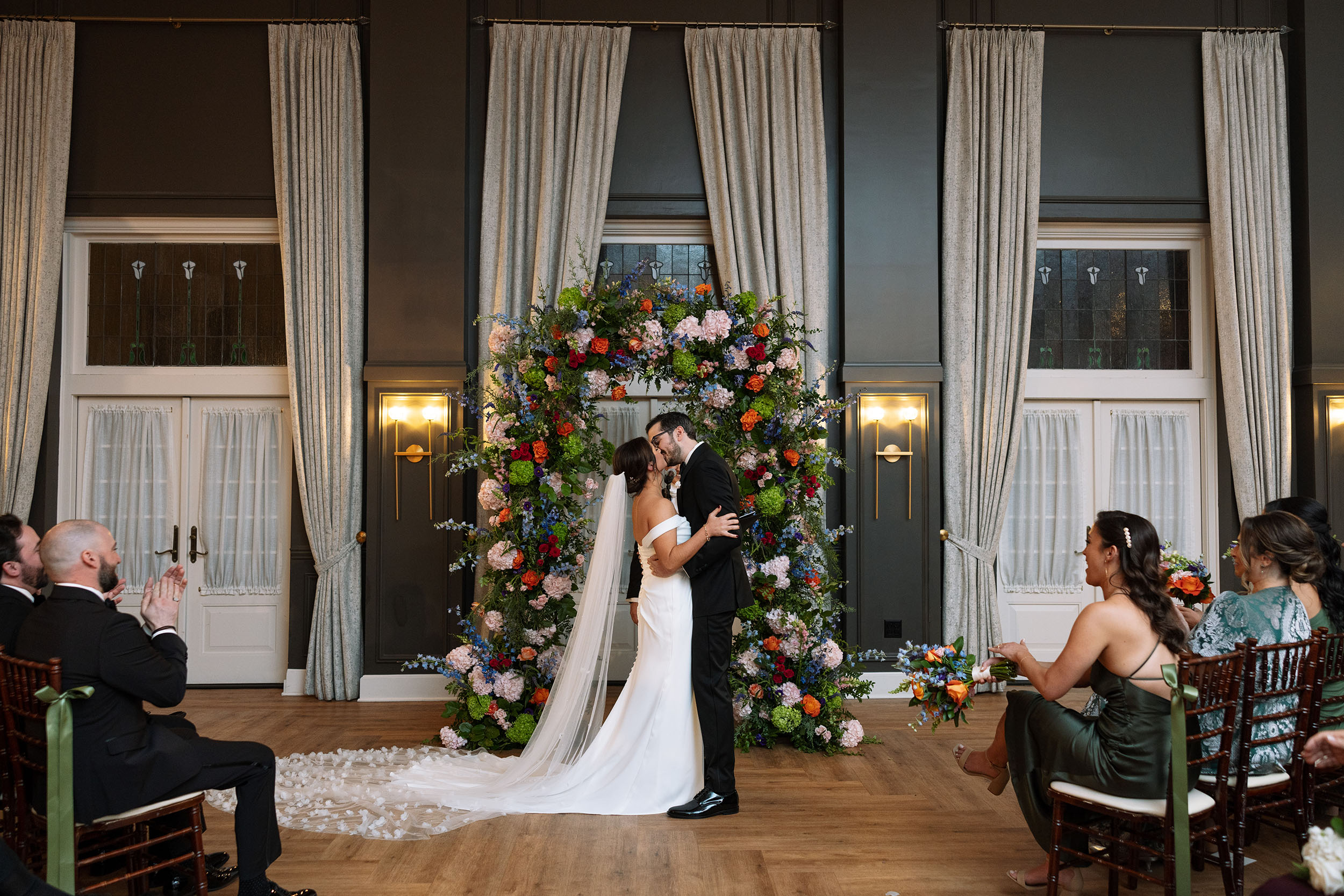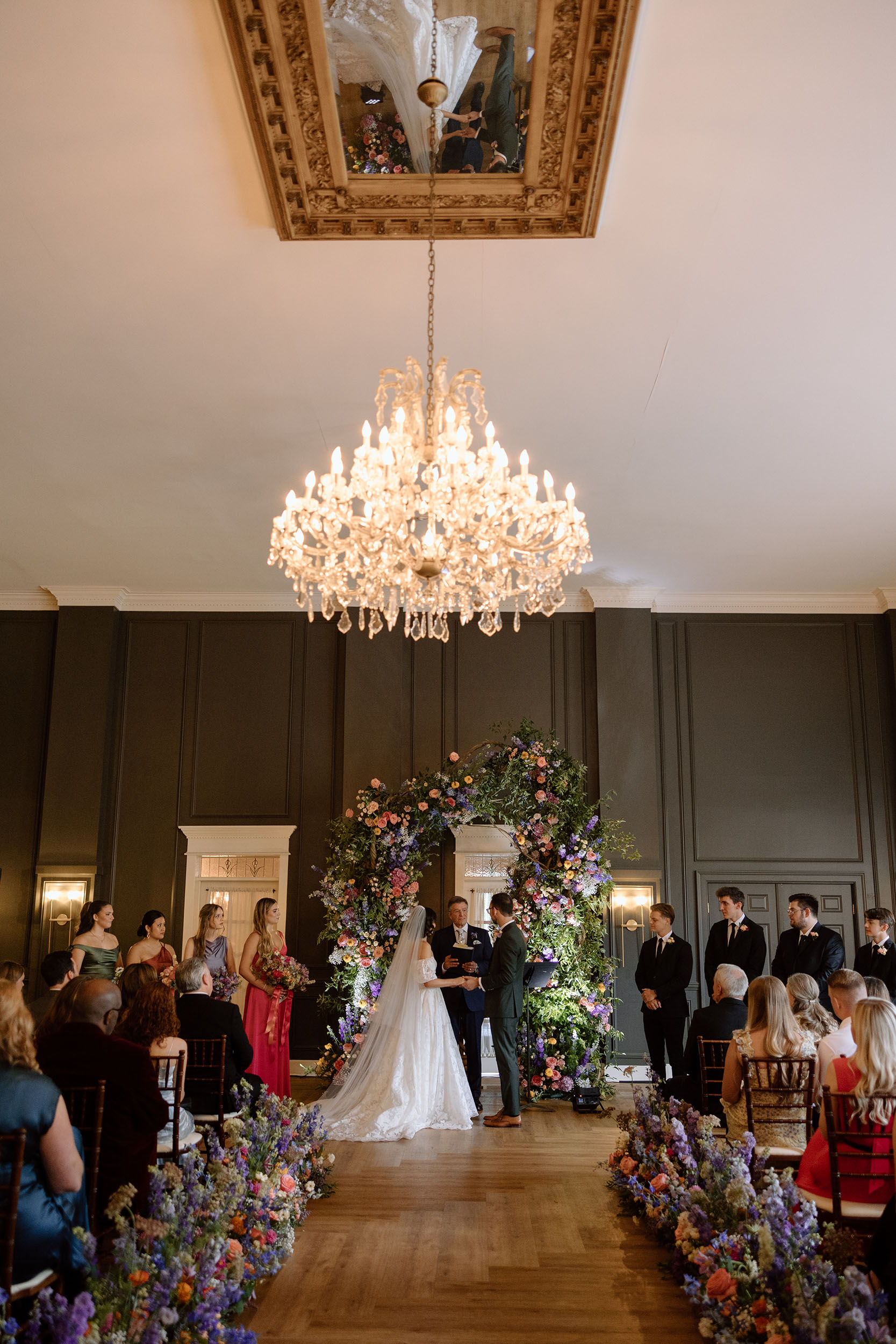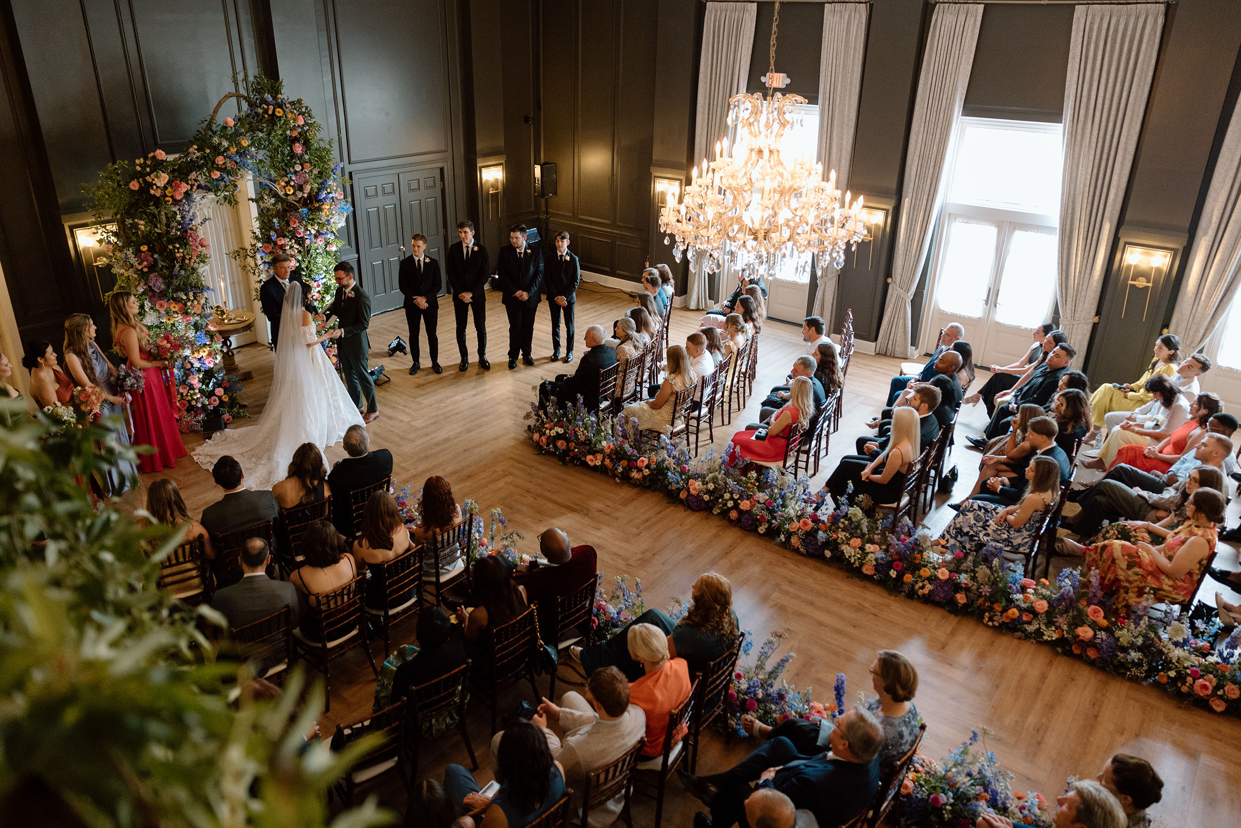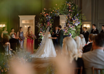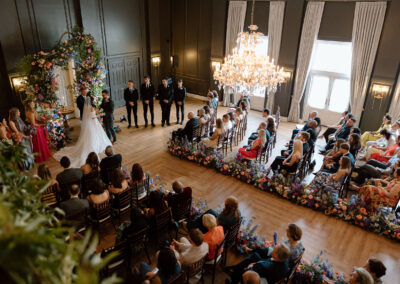 Your wedding ceremony can be held in our dramatic double-high ballroom featuring a stunning art deco stained glass ceiling. The wedding party can make their entrance by walking along the elegant second floor gallery. Couples can choose to have the wedding aisle lined with ornamental pillars and custom designed flower arrangements creating an atmosphere of sheer romance.
